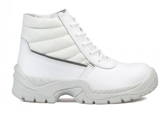 Botin Ombu Frances con punta de acero. Exterior de cuero Flor color Blanco. Planta antideslizante con inyeccion directa al corte en poliuretano bidensidad, no pegado. Planta auto limpiante. Traba escalera. Dielectrico. Resistente a la abrasion, a los hidrocarburos y los aceites. El interior es de textil de alta tenacidad con relleno soft. El forro del talon es reforzado. Horma anatomica. Permeabilidad al vapor de humedad.
