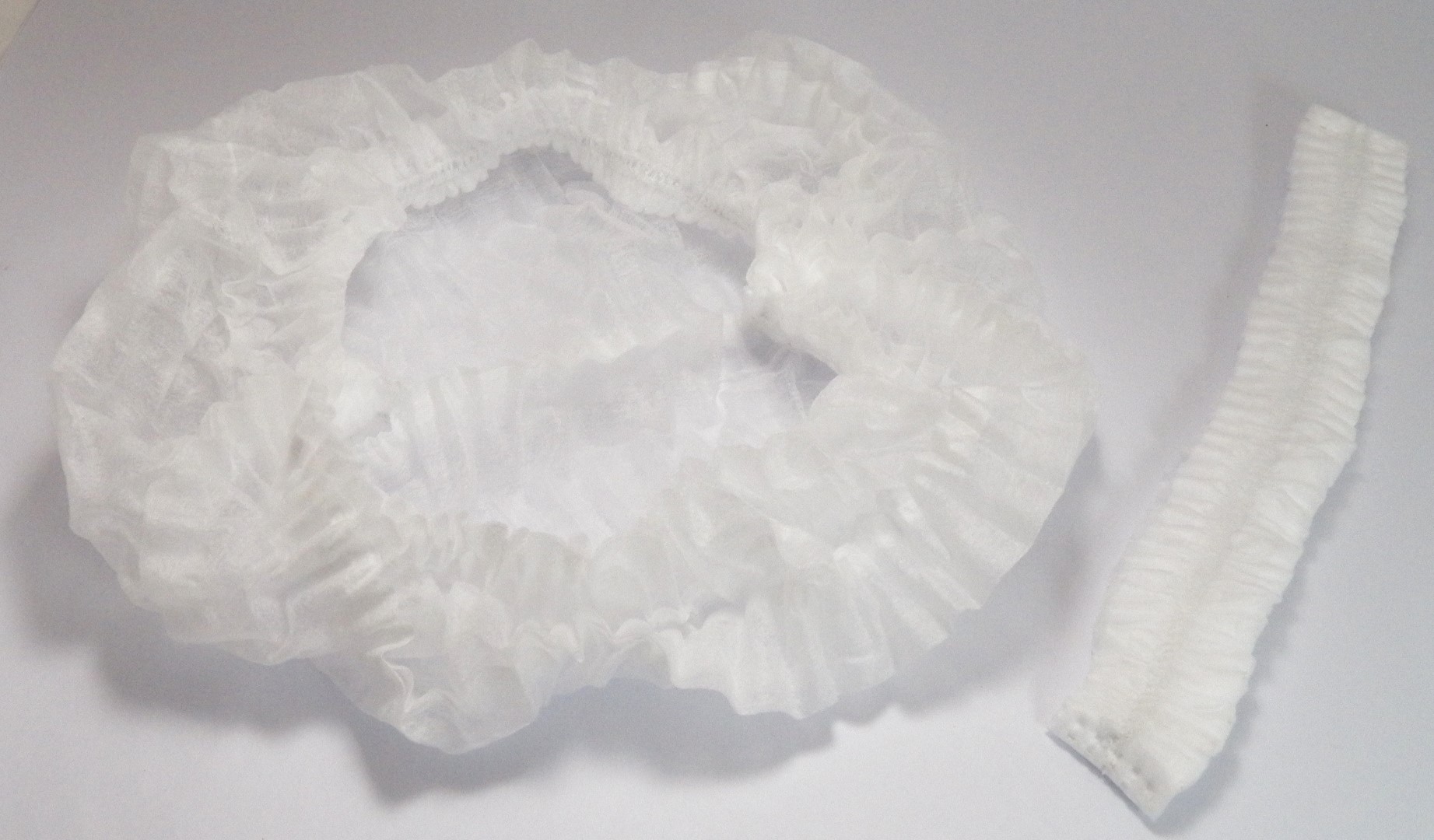 Cofia blanca, plisada en 18 pliegues, con elástico doble, confeccionada en tela Termobonded de 16 grs/m2. Unidad (Cód. 316) y a Granel x 500 unidades (Cód. 326).