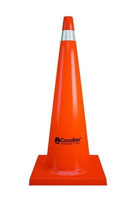 Cono naranja de polietileno semirígido, altura 100 cm, un collar reflectivo de 10 cm de ancho, base 45 x 45 cm, peso 1.85 Kg. Conoflex.