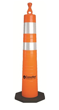 Cono naranja de polietileno semirígido, altura 120 cm, 2 collares reflectivos de 14 y 10 cm de ancho, base maciza octogonal de 45 x 45 cm, peso 6 Kg. Conoflex.