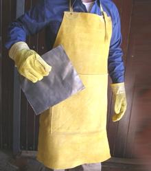 Delantal confeccionado en cuero descarne reforzado color amarillo y placa de plomo de 0.5 mm de espesor.