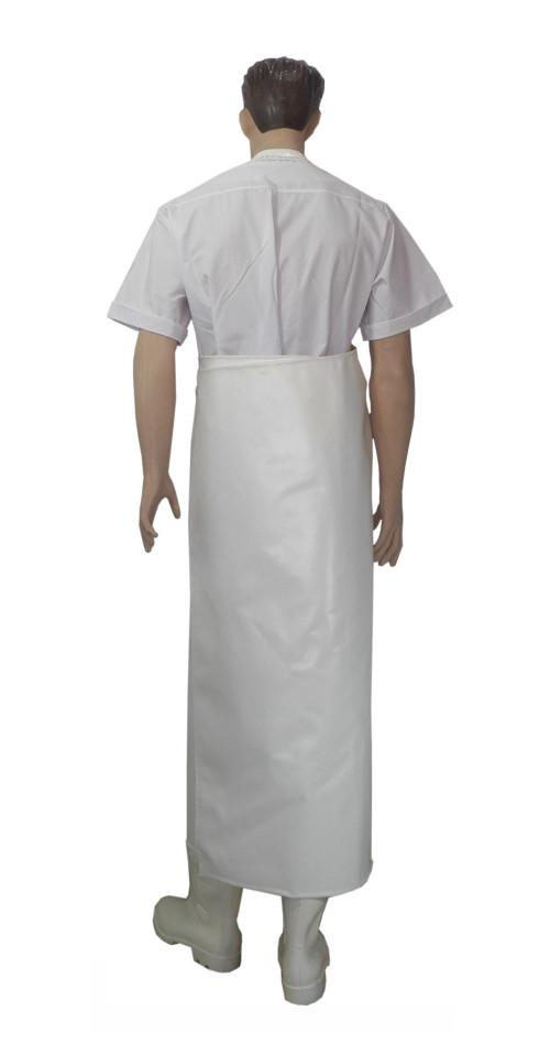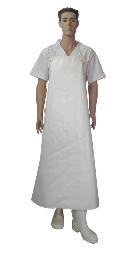 Delantal modelo cruzado confeccionado en tela PVC cobertura trama algodón con ojales de bronce y tiras para sujeción. Dobladillos para su refuerzo. Color blanco y amarillo. Largo 1,20 mts.