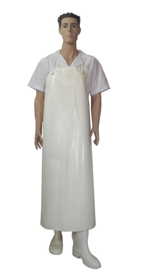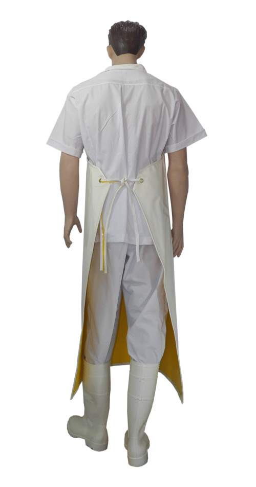 Delantal modelo simple confeccionado en tela PVC cobertura trama algodón con ojales de bronce y tiras para sujeción. Dobladillos para su refuerzo. Color blanco y amarillo. Largo 1,20 mts.