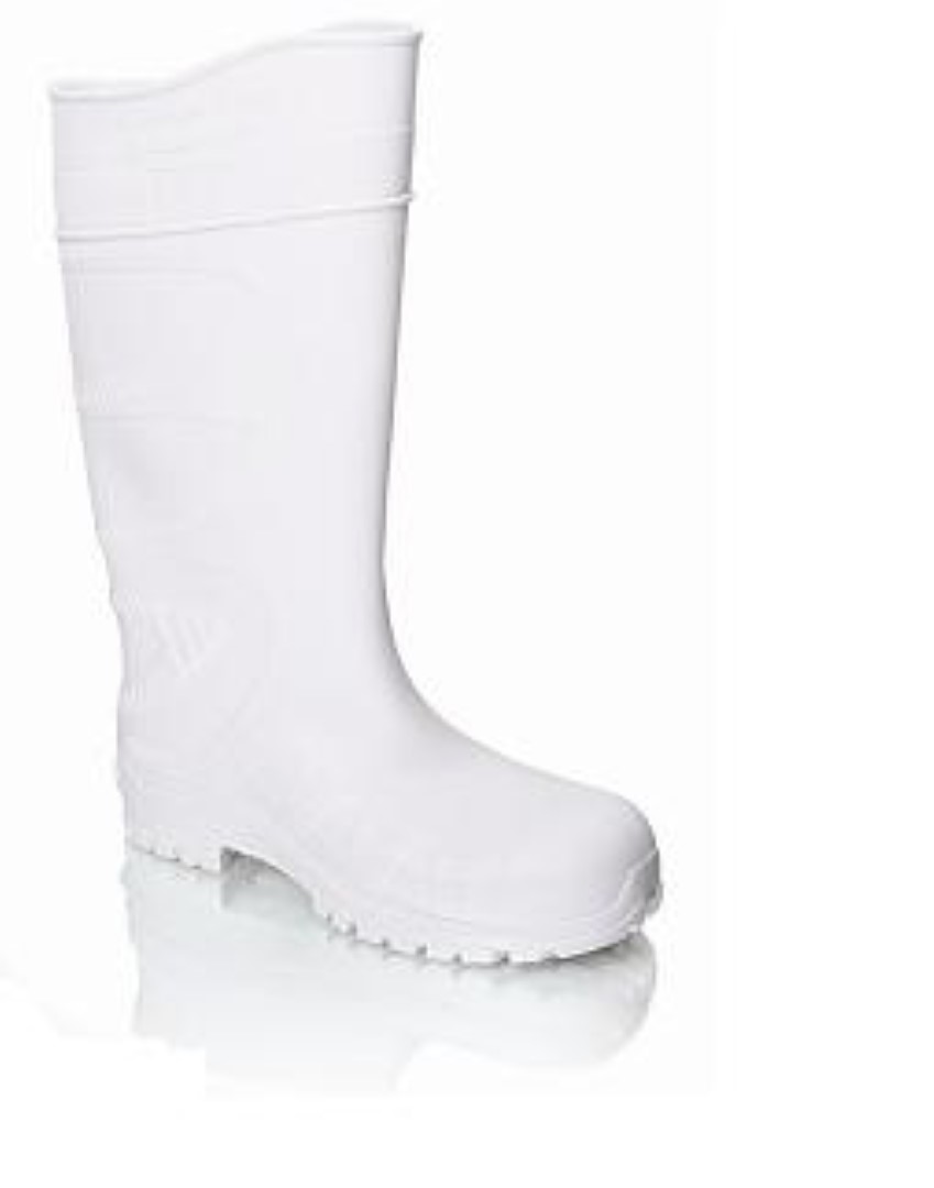 Bota Ombú, inyectadas en PVC, color blanca, caña, punta y talón reforzados, suela antideslizante y horma amplia que garantiza el confort. Nros. 38 al 45 inclusive.