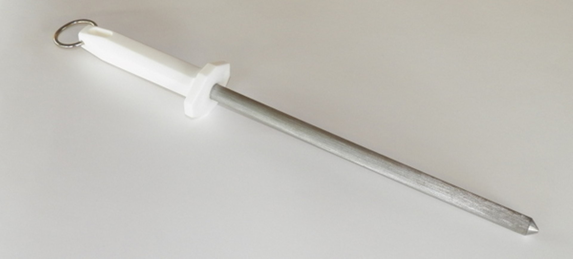 Chaira Mundial Profesional Rayada de 25 cm de largo, con cabo plástico blanco.