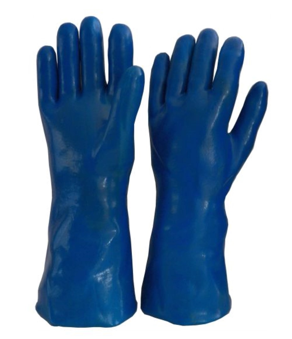 Guante de PVC con nitrilo, color azul. Con soporte interior de algodón. Mayor flexibilidad y tacto en manipulación de piezas pequeñas. Mayor resistencia y mejor flexibilidad con temperaturas bajas. Talle único. Usos: Especialmente para tareas donde se manipulan aceites, lubricantes, alcoholes, resinas epoxi, cal viva, herbicidas, insecticidas, pinturas y otros. Manejo de fluidos peligrosos, ácidos, aceites. Certificación IRAM 3607.
